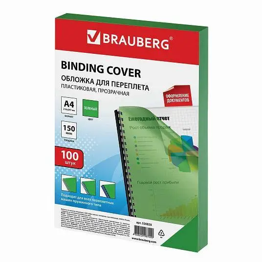 Обложки д/переплета BRAUBERG, 100шт, А4, 150мкм, прозр-зеленые